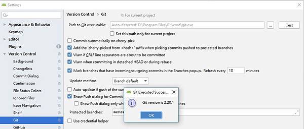 點開 Version Control,可以看到 Git,確定一下 Path to Git executable 路徑是否正確,可以直接點右側的 Test 試試看,如果有裝成功,會出現如下畫面: